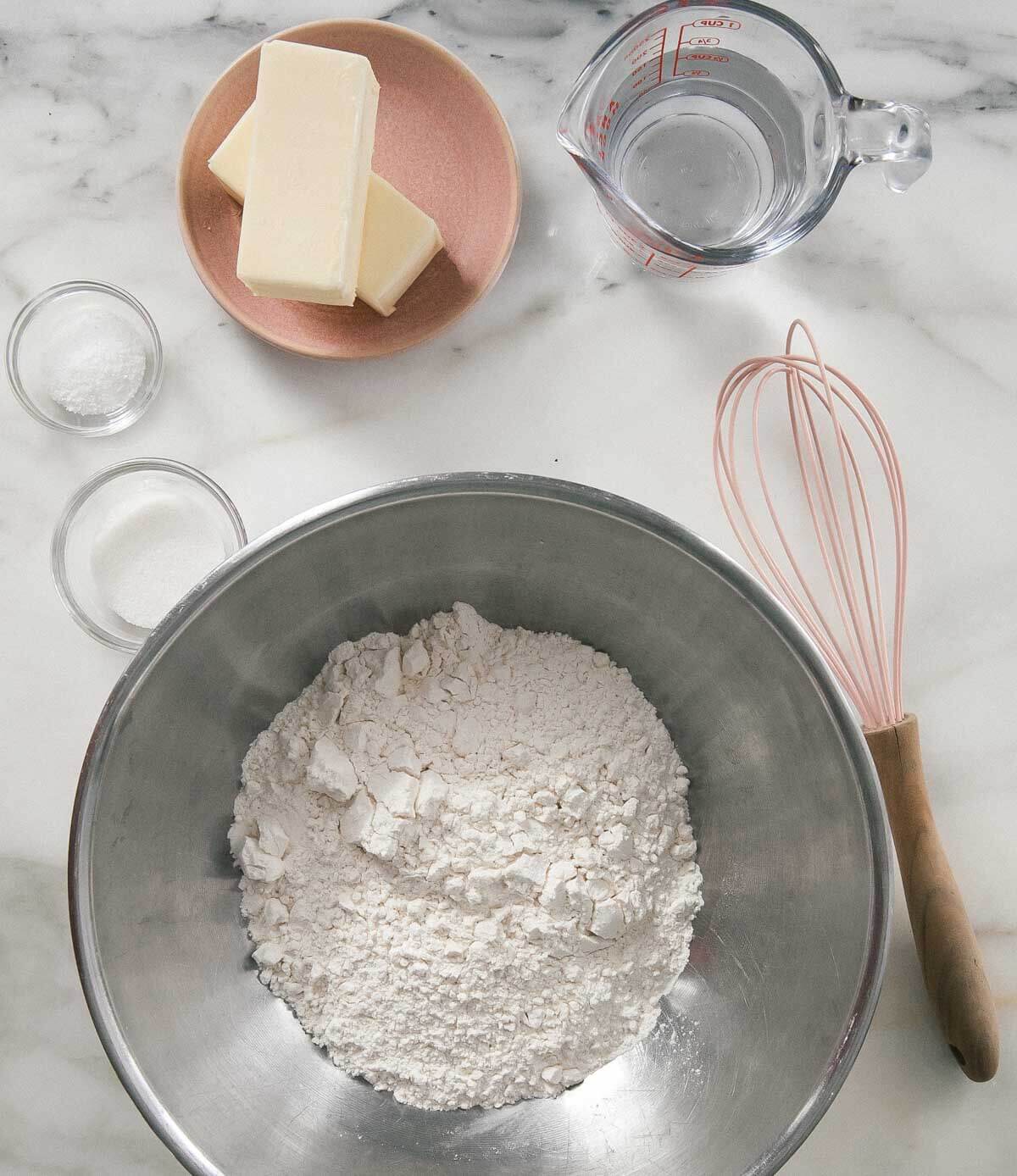 - In a large bowl, mix together the flour, sugar and salt. Using a box grater, grate the cold butter atop the flour mixture. Transfer to the freezer to chill for 10 minutes. Working quickly, and using your hands, break the butter bits into the flour until theyโre evenly distributed and resemble the size of teeny, small peas. Add a 50% of the recommended water and mix.