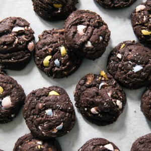 These Chocolate Cadbury Egg Cookies are a great way to either use up leftover Easter candy or use it to celebrate the holiday itself. They’re chewy and full of crunchy candy to make an ultimate Easter dessert.