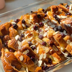 Lemon Blueberry Overnight French Toast topped with blueberries and slivered almonds.