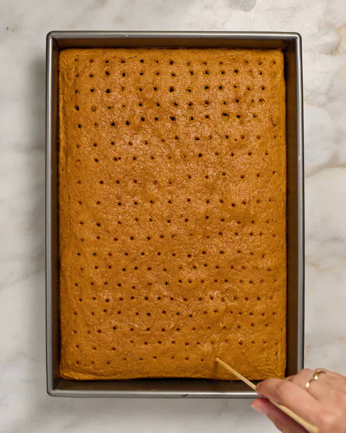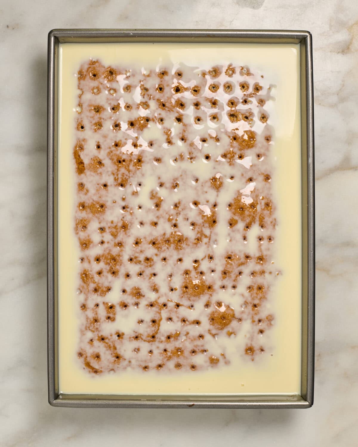 7. Let it cool then soak. Let the cake cool completely then poke holes all over and pour the 3 milks over the top.
