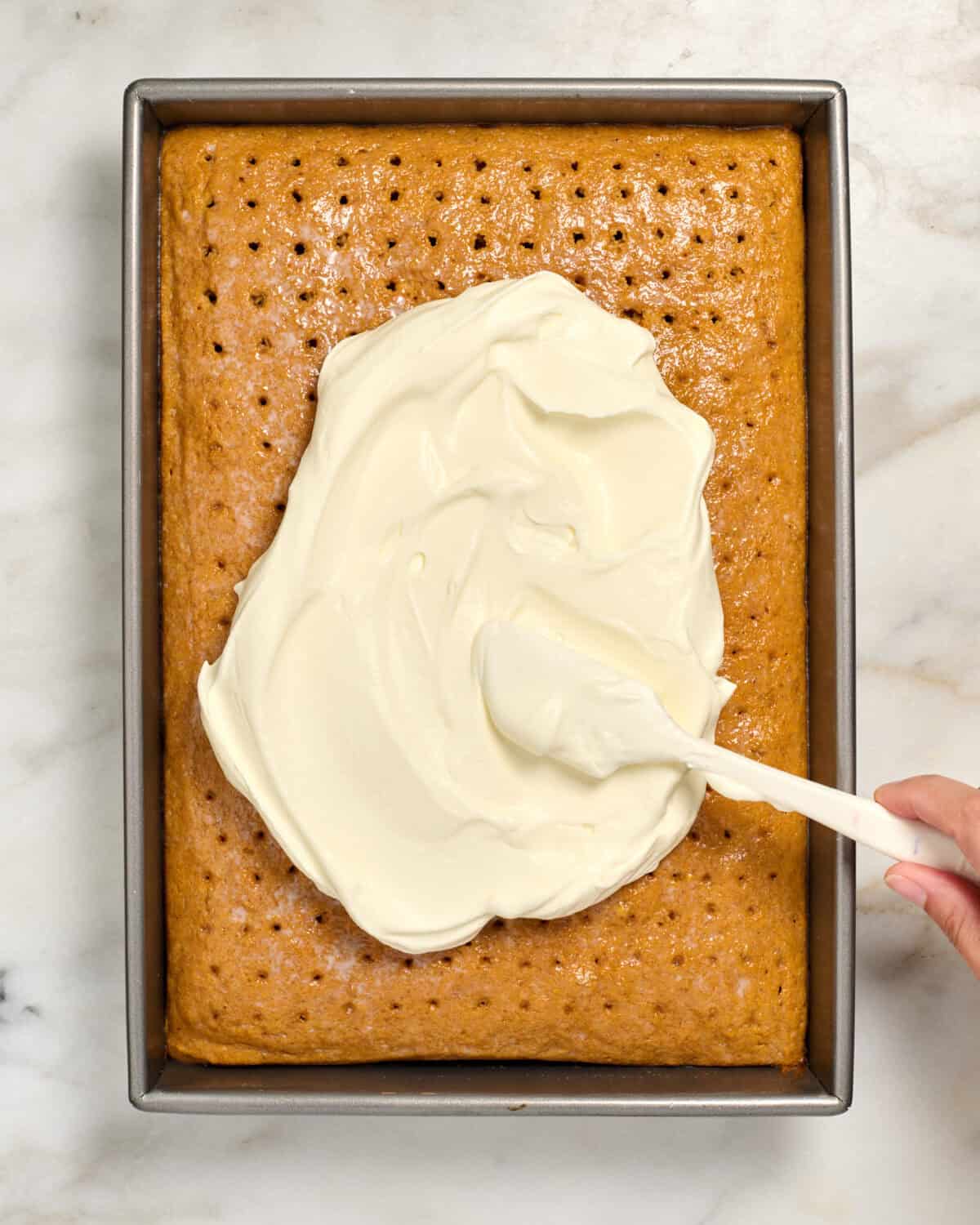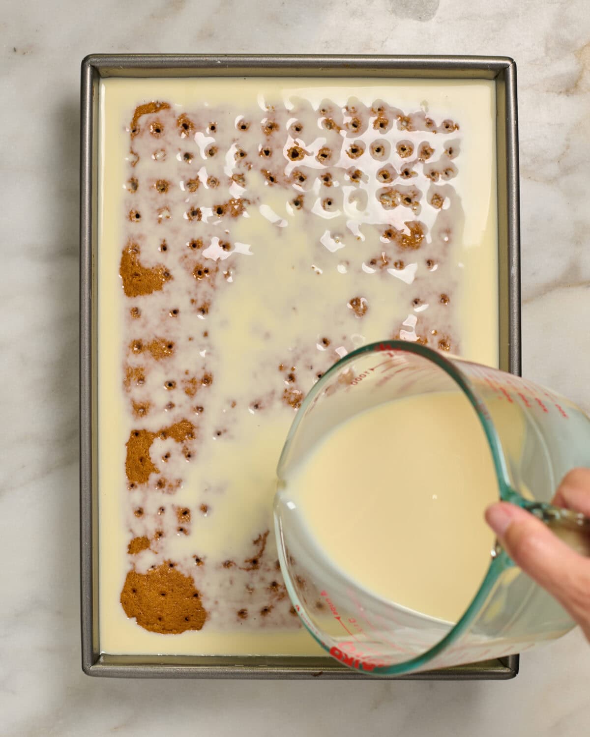 - In a large measuring cup, add whole milk, sweetened condensed milk and heavy cream. Whisk until combined. Using a skewer, create little holes on the top of the cake. Pour the milk mixture over the cake (it may seem like a lot but it will absorb!). Transfer to the fridge to 2 to 3 hours, ideally overnight.
