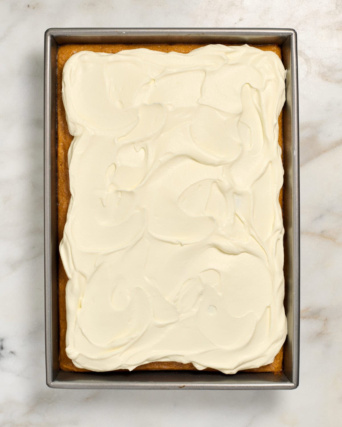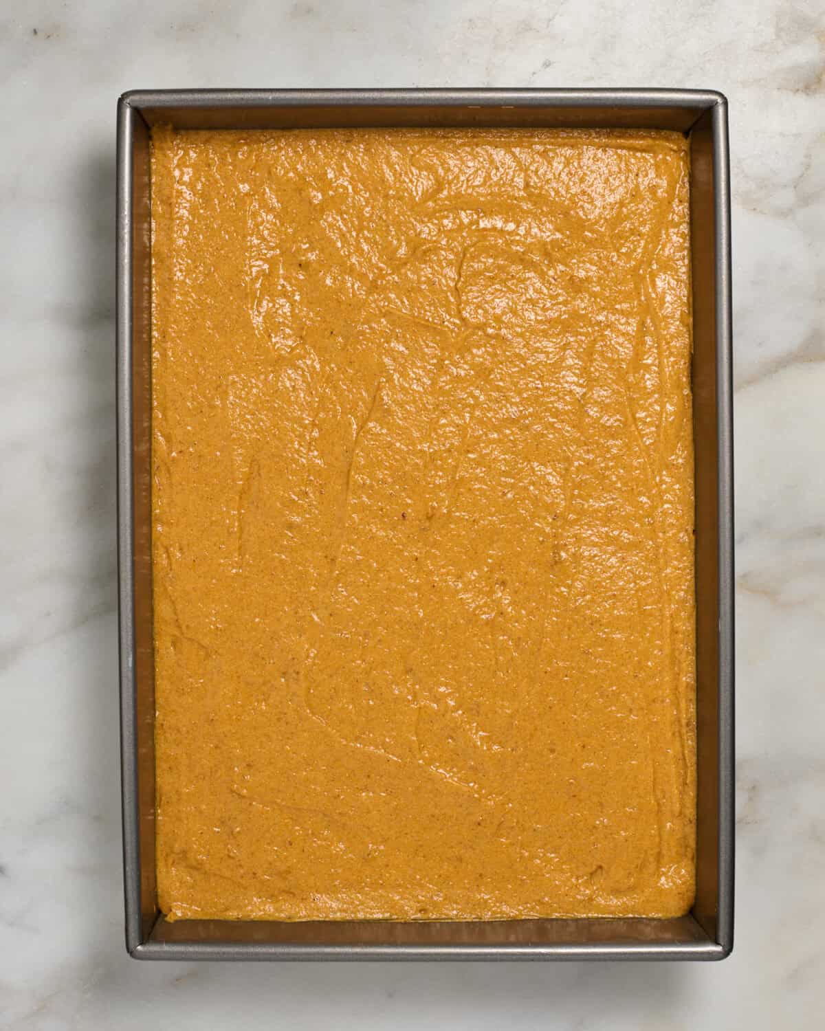 6. Bake! Add the batter to a prepared 9×13″ pan and bake just until a toothpick comes out clean.