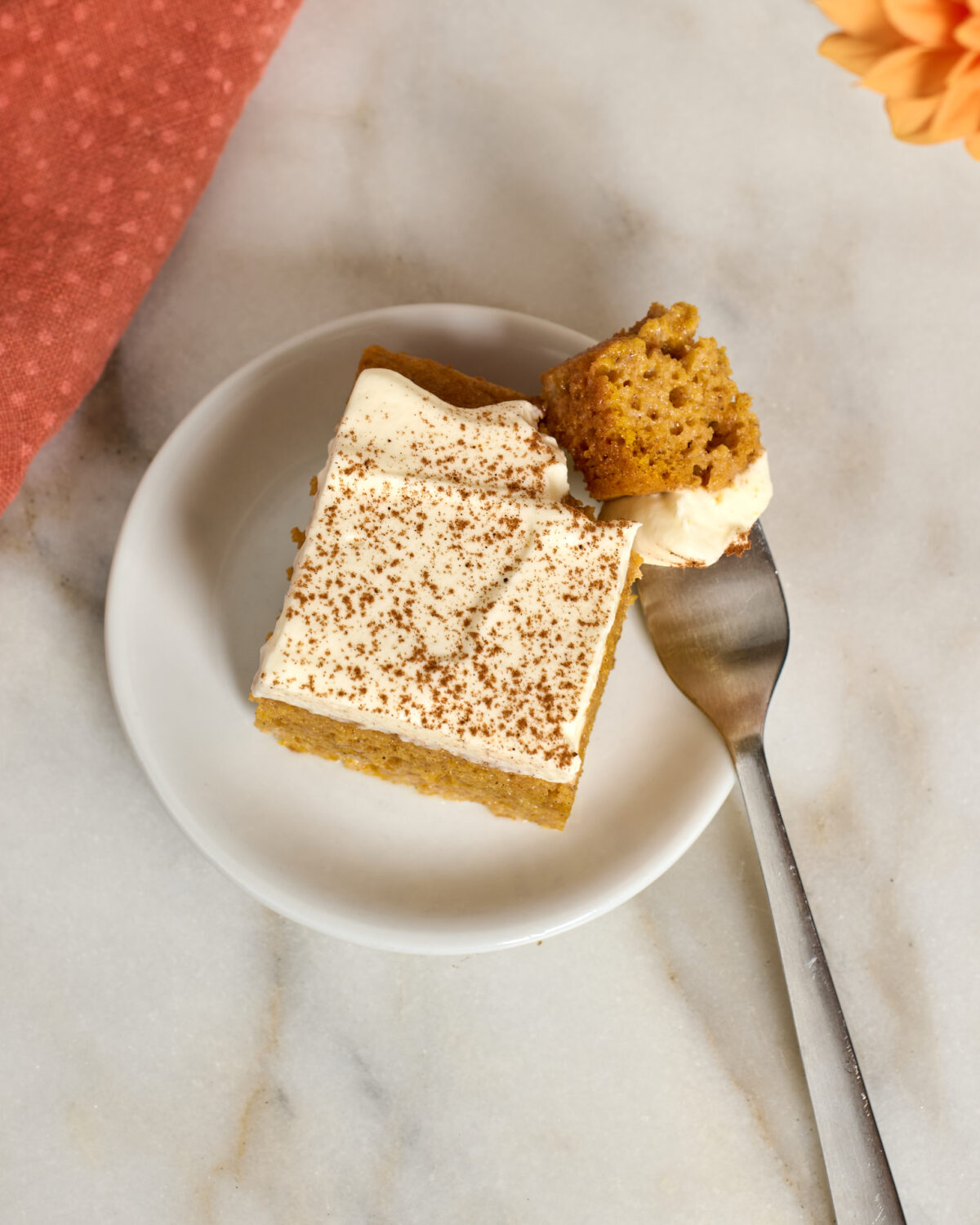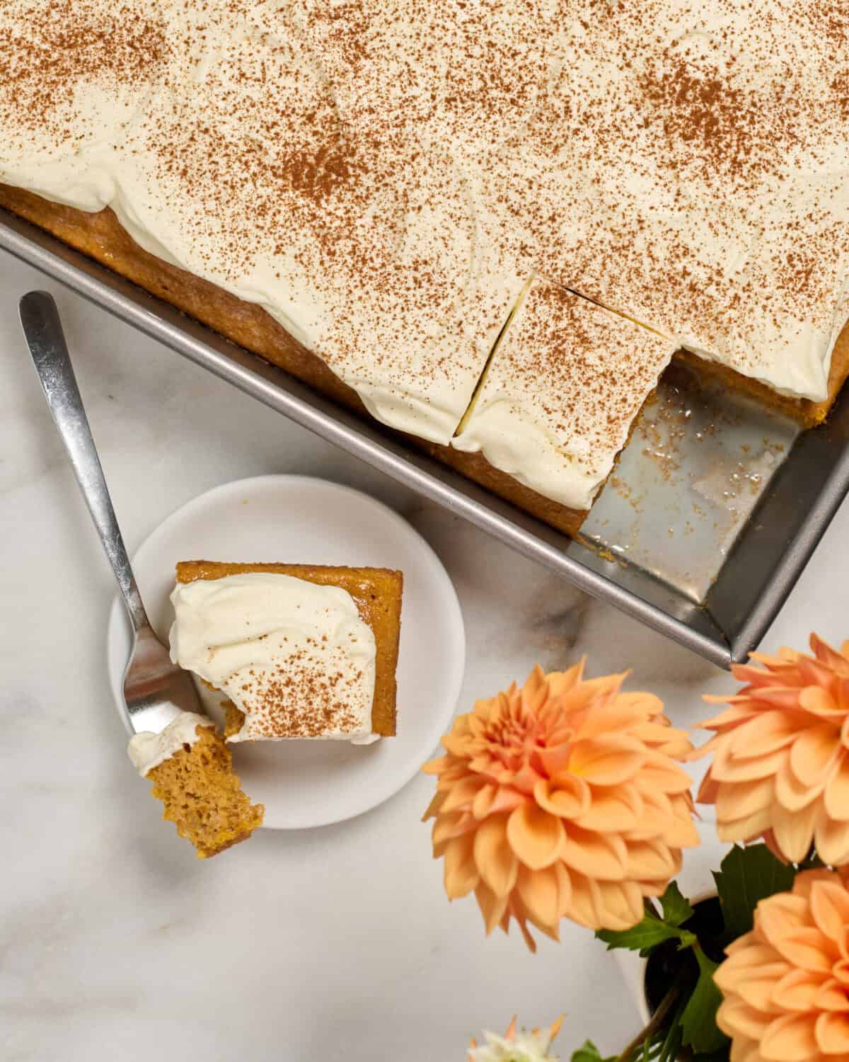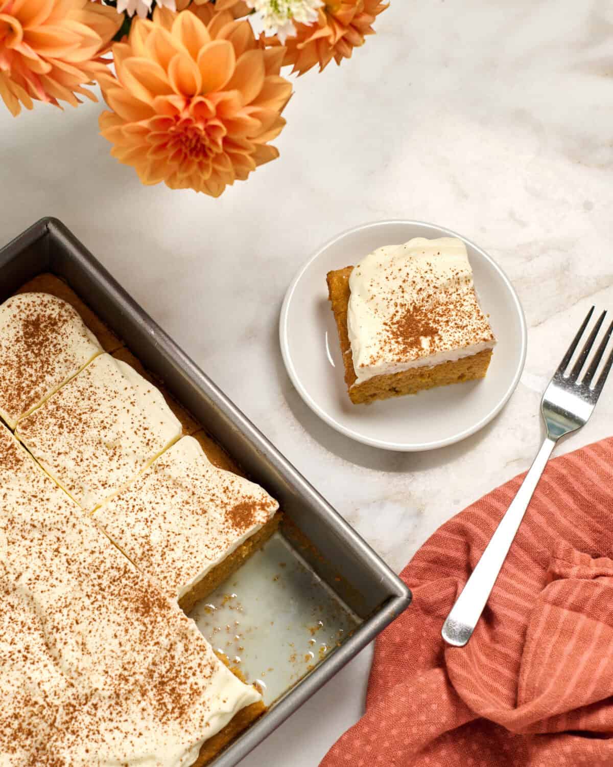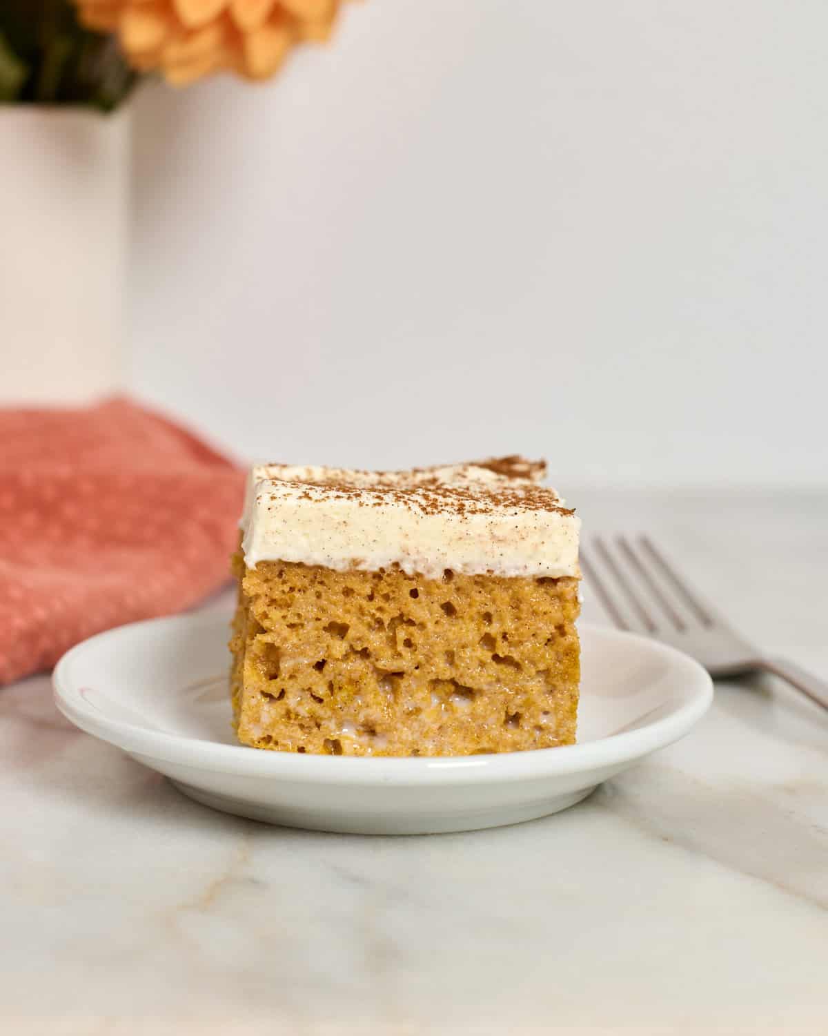 - Just before serving, top the cake with fluffy whipped cream and dust with cinnamon or pumpkin pie spice. Slice and serve.