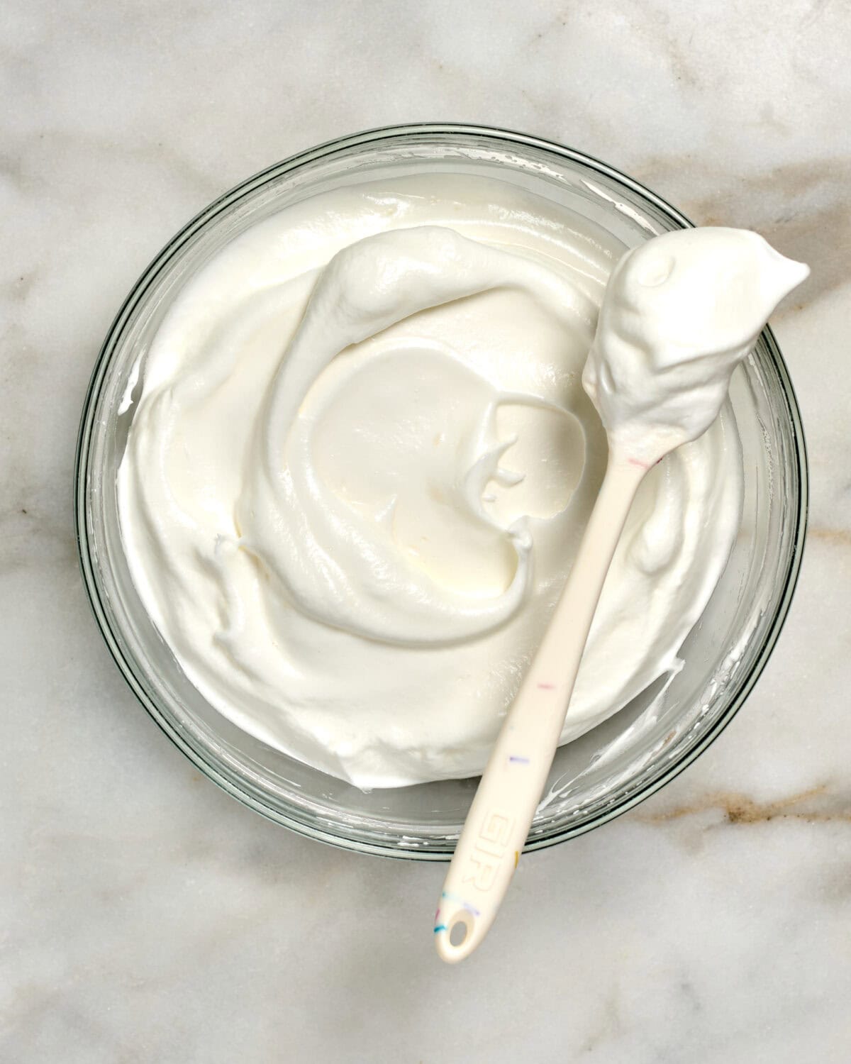 - Fold in the egg whites until you no longer see any speckles of remaining egg white.