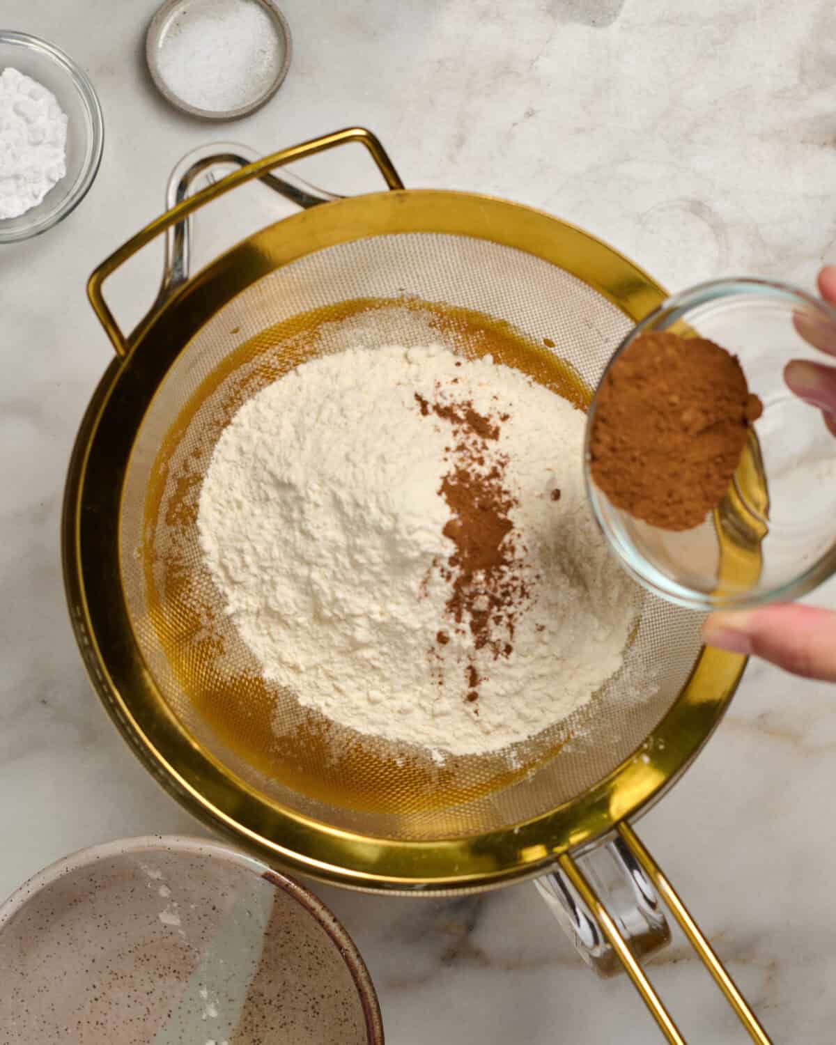 - Place a sieve atop the bowl on the stand-up mixer and sift in the flour, baking powder, pumpkin spice and salt. Mix until just combined.