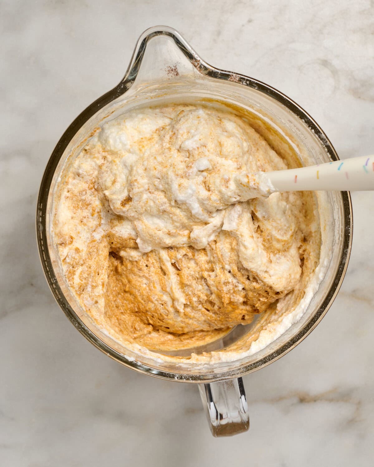 5. Fold the egg whites in. Now we take and fold in those egg whites from step 1, making sure we don’t over mix. Don’t panic if there’s a little bit of egg whites that didn’t mix in 100%.