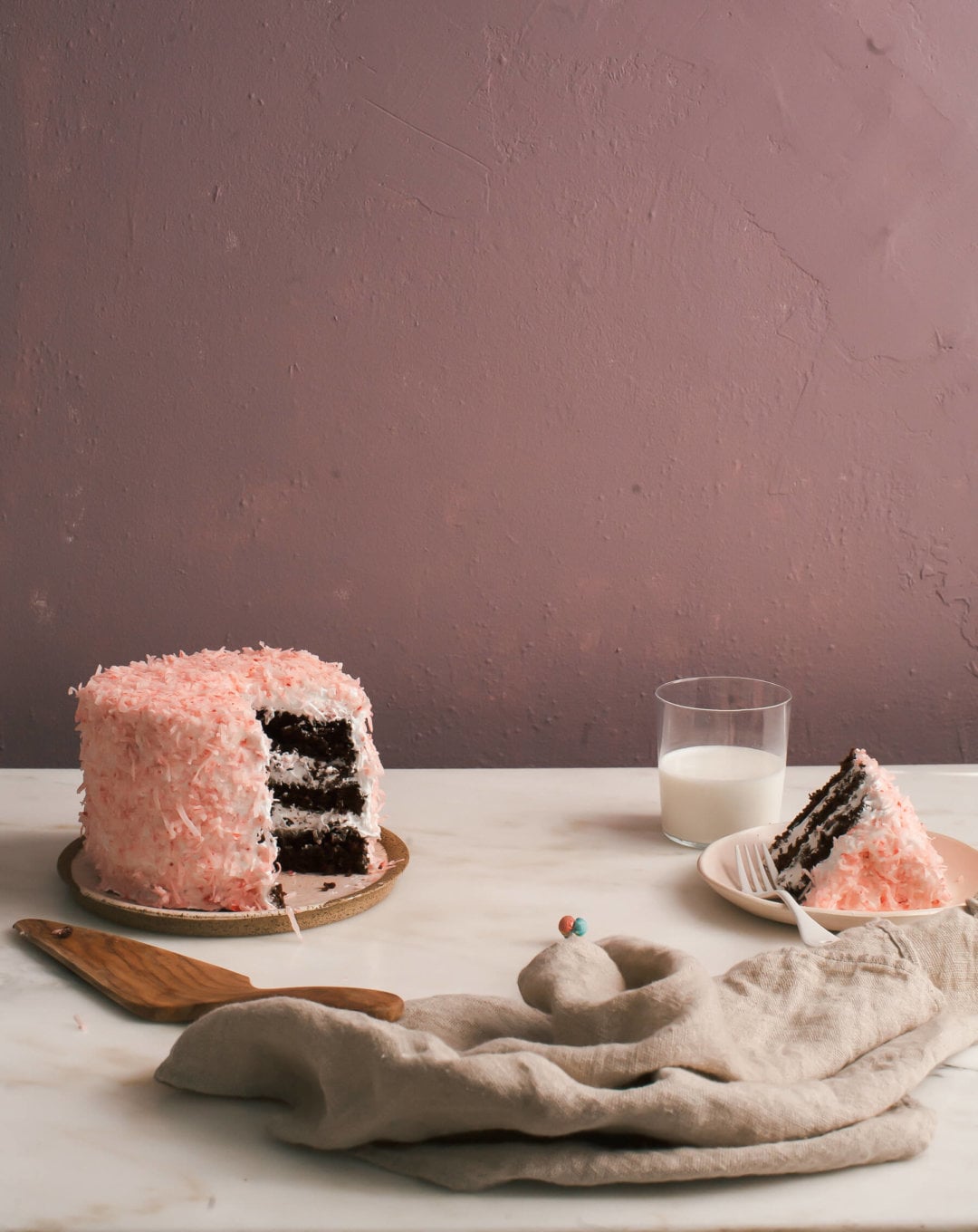 This cake is a two-layer chocolate cake with marshmallow fluff in between the layers and all on the outside. The baby pink coconut flakes are all over the cake, top and sides.