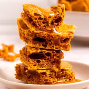 Prep! - It’s important to have all of your ingredients and baking sheet ready. This recipe moves very quickly.Use a large pot. I used a 5-quart Dutch oven because once you add the baking soda, the candy bubbles up a lot more than you think!Thickness - I used a half baking sheet. And it was on the thinner side. If you want it thicker, then feel free to use a 8x8 inch baking pan lined with parchment.Cook the mixture for the full 3 minutes, as chewiness is a result of the mixture not cooking long enough.Store honeycomb candy in an airtight container. If you live in a very humid place, you might have trouble keeping it crispy for a long period of time.Equipment:5-Quart Dutch Oven | Silicon Spatula | Baking Sheets |